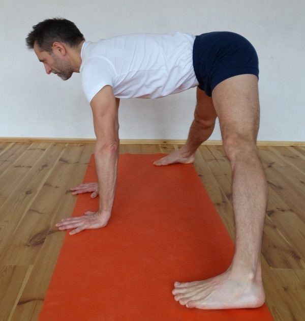 5. Z wydechem pochyl tułów równolegle do podłogi i połóż dłonie na podłodze pod barkami.
