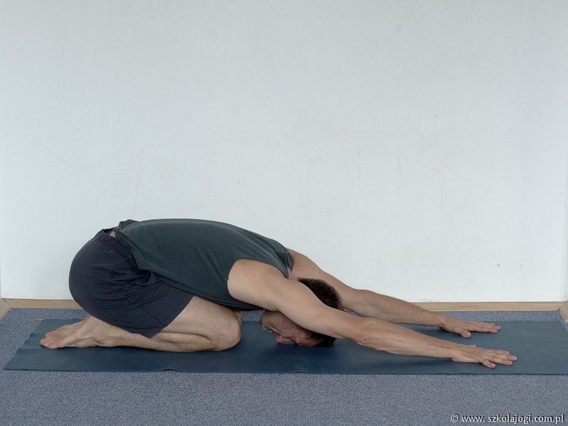 - Wyciągając przód tułowia oprzyj brzuch na udach a czoło na podłodze.